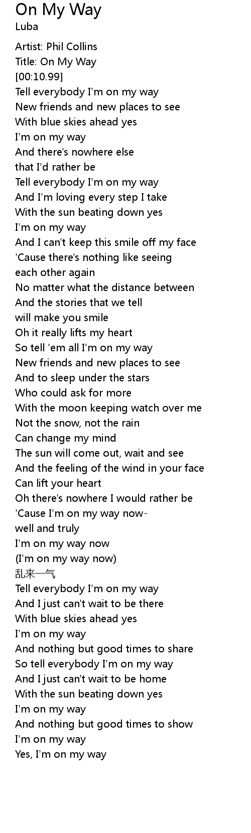 This is the lyrics of On My Way from Disney's Brother Bear.. On My Way Lyrics Phil Collins are a subject that is being searched for and liked by netizens these days. You can Get the On My Way Lyrics Phil Collins here. Save all royalty-free pic. Phil Collins - On My Way ( Lyrics ) 🎵, Phil Collins - On My Way ( Lyrics ) Spotify .